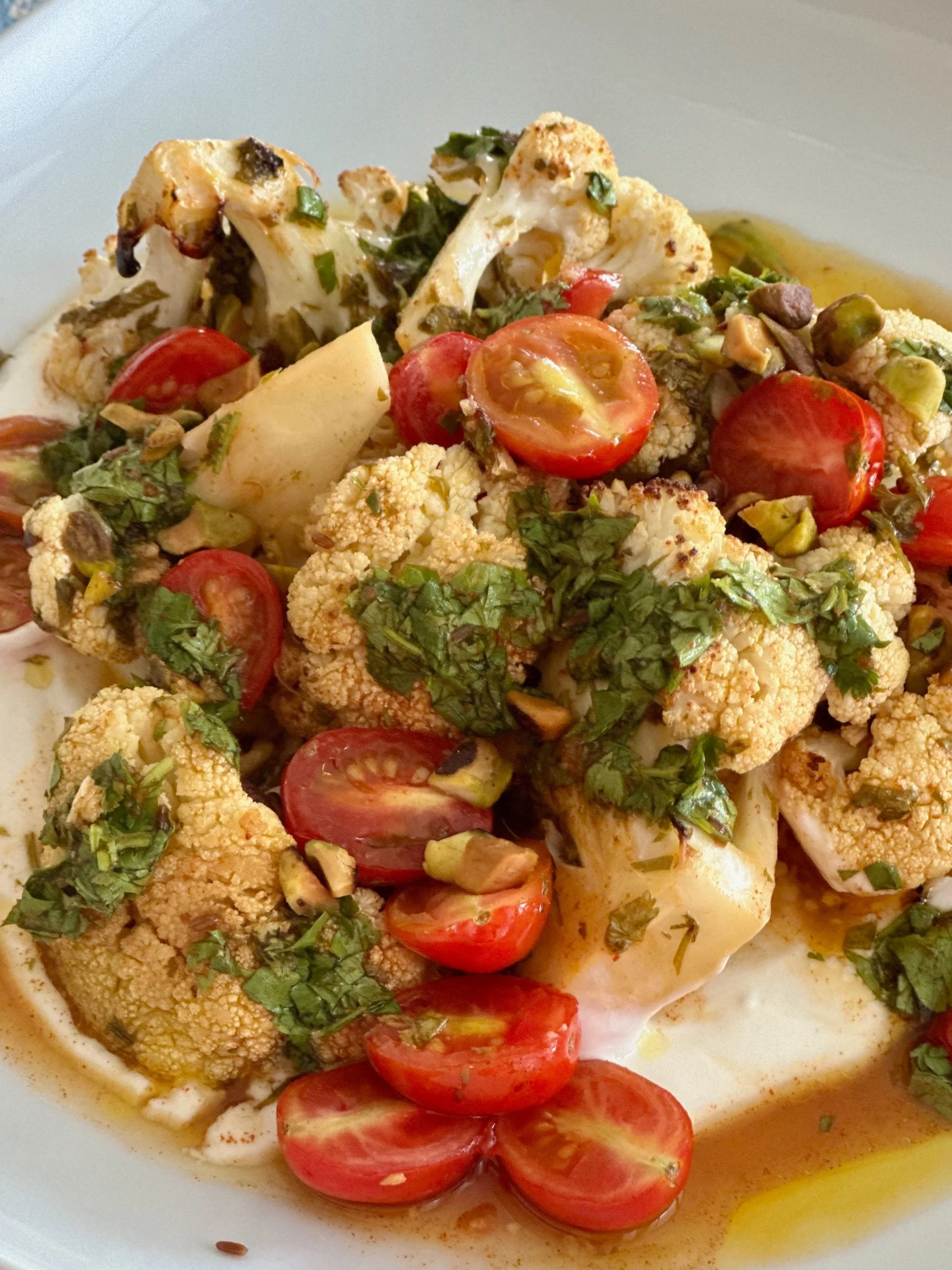 Spread the yogurt on a large plate and arrange the cauliflower and tomatoes on top of the yogurt. Drizzle the remaining chermoula sauce and some olive oil on top of the cauliflower. Sprinkle some of the chopped pistachios on top and serve.